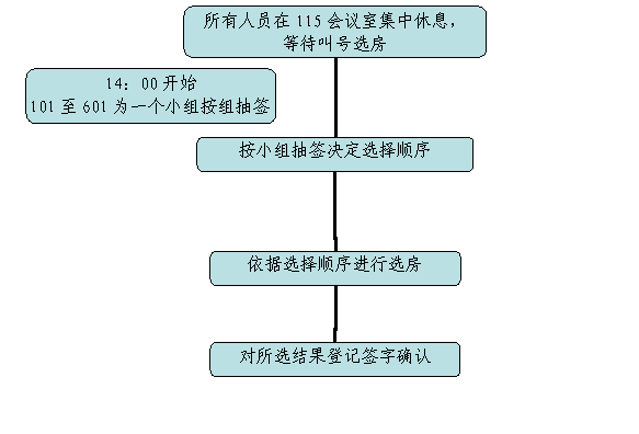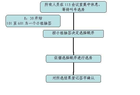 设立一个接待室(大学生活动中心115室),两个选房室(大学生活动中心126室、128室),具体流程如下: