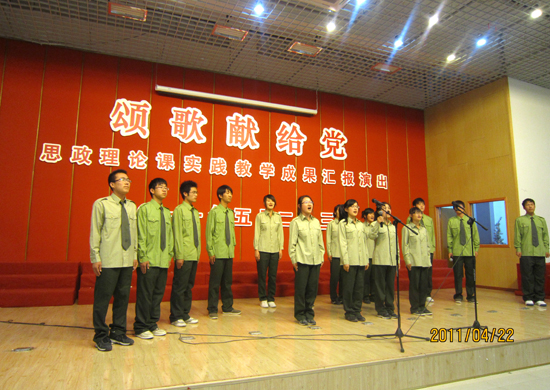 5月23日晚,由思政教研部主办的的“颂歌献给党”——《思政概论》课实践教学成果汇报活动在我院大学生活动中心举行。思政部全体教师出席晚会并担任评委。在全院同学广泛参与的基础上,50名参赛选手共演唱了红歌20首,经过激烈的角逐,最终产生一等奖3名,二等奖6名,三等奖7名,鼓励奖2名。此次红歌演唱活动不仅展现了思政课实践教学的优秀成果,也见证了学院2010届大学生的艺术风采,学子们的歌声更为党的“90华诞”献上了自己最美好的祝福。