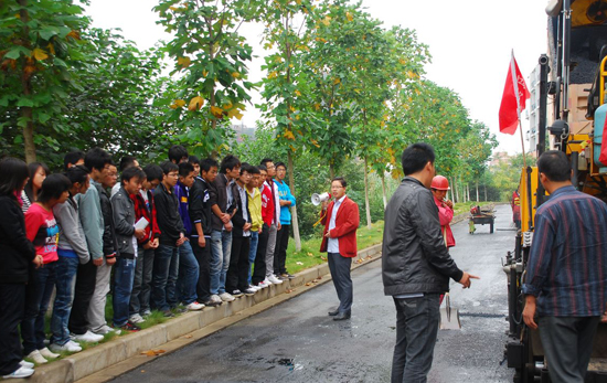 施工队负责人向同学们现场介绍了校园内沥青路面摊铺的相关情况。老师们进行现场教学,对照现场施工组织和机械设备向学生详细介绍了路面摊铺的施工工艺和碾压成型的全过程,还将施工的实际情况与书本上的知识进行对比,让学生加深对知识的理解和消化,真正做到理论联系实际。