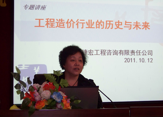 10月11日下午,南京市工程造价管理协会会长、江苏捷宏工程咨询有限公司总经理吴虹鸥女士应邀来系作讲座。这是吴女士继“造价师的生活”讲座之后,又一次来系开设讲座。系部领导、部分教师及工程造价、建筑工程技术专业200余名学生在明德楼报告厅聆听,讲座由系副主任陈晋中主持。