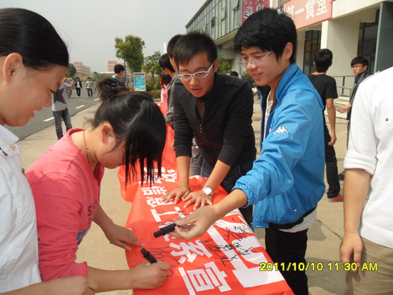10月10日,辛亥革命100周年纪念日当天,电子信息工程系学生会在学院思源堂广场举办了“百年辛亥 和谐校园”签名活动。同学们积极响应,主动签名,在辛亥革命主题图片展前驻足,了解革命过程、历史人物和时代价值。一位张姓同学郑重签下自己的名字后表示:“行动是最好的纪念,发展是最好的继承。作为一名大学生要继承和弘扬孙中山先生等革命先贤忧国忧民、以振兴中华为己任的爱国主义精神;与时俱进、敢为天下先的创新精神,矢志不移、百折不挠的奋斗精神;以及济世为怀、无私奉献的博爱精神,好好学习,努力成才,回报学校,回报社会,争做时代先锋”。