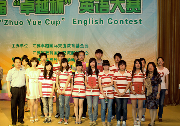 在6月8日上午由江苏卓越国际交流教育基金会和江苏省教育国际交流服务中心主办的第二届“卓越杯”英语大赛决赛中,国际教育学院海本项目2010级张伟、陈云杰、戴帆三名同学荣获二等获,4名选手获得三等奖,6名选手获得优秀鼓励奖。他们分别获得由卓越交流基金会提供的2000元、1000元和500元卓越留学奖学金。