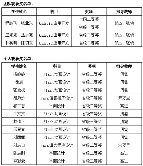 学院电子信息工程系程鹏飞、张业兴同学组成的“Android驾校通”团队获得省级一等奖,成为122支入围Android应用开发科目总决赛的本专科院校团队之一,并于12月16日在北京航空航天大学举办的总决赛中获得了Android应用开发团队赛全国二等奖。此外,还有多名学生获得了个人赛省级二等奖、三等奖。