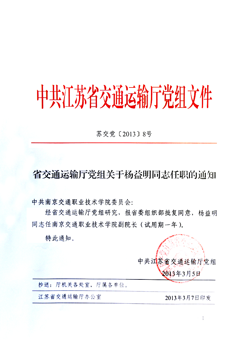 省交通运输厅党组关于杨益明同志任职的通知