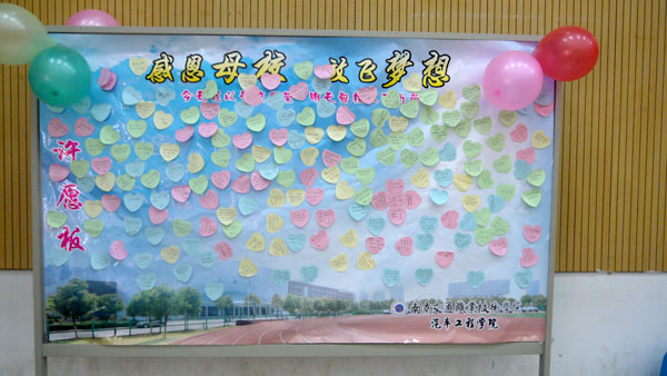 “青春不散场,未完待续……我们期待明天更美好。”“旧日的黄土高坡已然变成了芳草连天,希望校园越来越美。”“十年树木,百年树人,不忘恩师教导,祝自己成功!”“衷心祝愿不一般的62班的亲们,未来不是梦。”…… 5月15日上午,汽车工程学院2013年469名毕业学子在毕业典礼结束后,争相写下对自己、对同学、对学校的祈愿和祝福,贴到“许愿板”上,为自己三年交院生活留下感恩印迹。