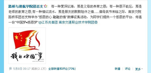 5月10日至5月12日,在“母亲节”来临之际,由路桥与港航工程学院团总支主办的“中国梦•感恩梦—感恩的心,融融的情” 微博征集活动在全院范围内火热开展。广大同学通过发微博的形式表达对母亲的感恩之情,再次体认爱与亲情。