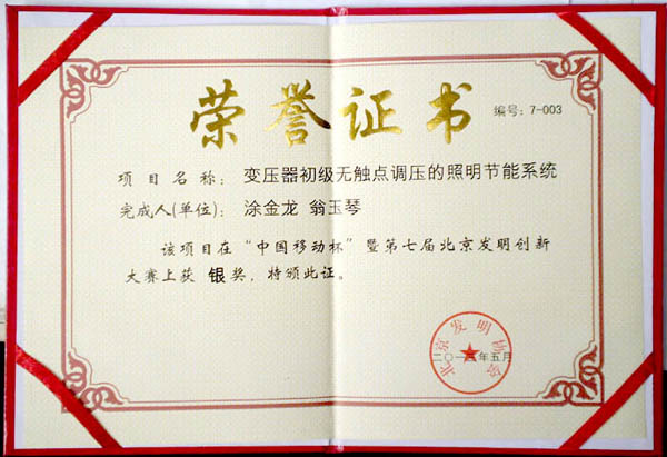 我校机电工程学院涂金龙老师的参赛项目“变压器初级无触点调压的照明节能系统”获得发明创新大赛银奖。该项目还被选为“中海发明创业专项奖”候选项目。经过专场答辩和专家组评审,该项目获得“中海发明创业专项奖”(第1名)。