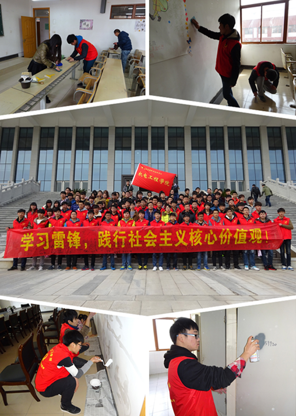 3月11日中午,志愿者们在思源堂门口举办了“学习雷锋精神,践行社会主义核心价值观”主题签名活动,发放学习雷锋精神的宣传材料。下午14时,机电学院的120多名志愿者来到明志楼,粉刷墙面,打扫楼梯,清洁地面,捡拾垃圾,铲除卫生间的小广告等,使明志楼内的容貌焕然一新。