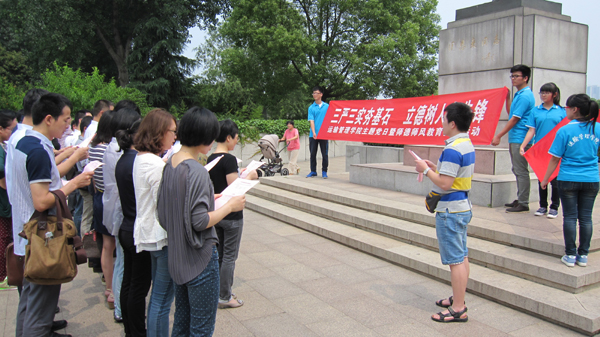 最后,在周恩来总理铜像广场前,全体党员一起重温了入党誓词;全体教师集体宣读了《高等学校教师职业道德规范》,誓以“爱国守法,敬业爱生,教书育人,严谨治学,服务社会,为人师表”24个字的职业道德规范为准绳,做一名好老师。