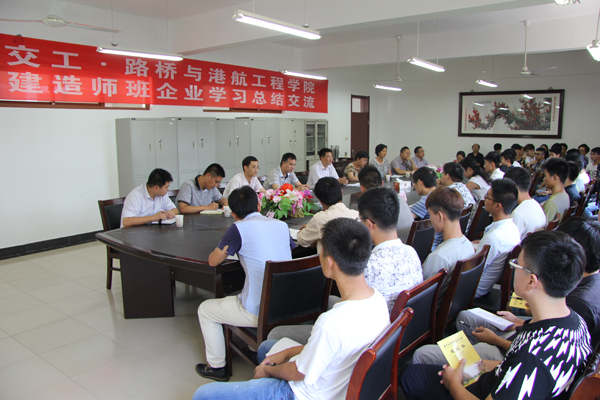9月9日下午,“江苏交工•港航建造师班”企业学习总结交流活动在修远楼305会议室召开。江苏省交工集团有限公司领导和企业导师朱乾震等一行四人,学院教务处祁洪祥处长、督导室张晓莺副主任、路桥与港航工程学院领导、港航教研室全体教师以及”江苏交工•港航建造师班”43名同学参加了学习交流。活动由路桥与港航工程学院蒋玲院长主持。
