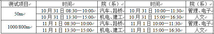 为贯彻落实《国务院办公厅转发教育部等部门关于进一步加强学校体育工作若干意见的通知》精神和省教育厅《国家学生体质健康标准》测试和上报工作的通知精神,定于 10月31日(全天)、11月1日(全天)在田径场进行新生体质健康测试(50m、800/1000m)。请各二级学院、系组织安排学生参与测试。测试时间安排如下: