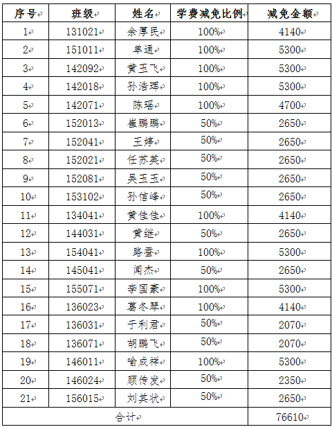 经学生本人申请、院系初审、学工处审核,并报学院行政办公会议审定,以下21名同学获2015-2016学年学费减免资助,现予以公示: