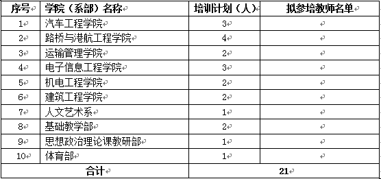 教师教学能力提升培训按学校专任教师总数的5%比例申报培训计划,各学院(系部)培训指标分配如下: