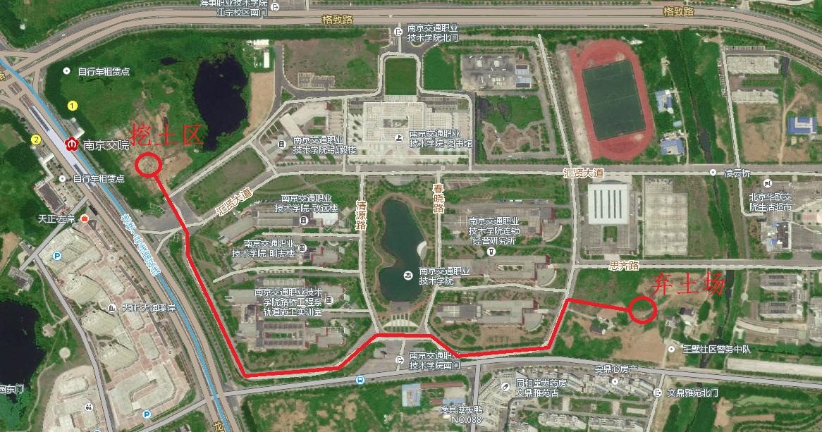 2、土方运输路线:在建工程西南角运出→西大门→通达路→南大门→闻远路→预留堆土场(详见附图)。
