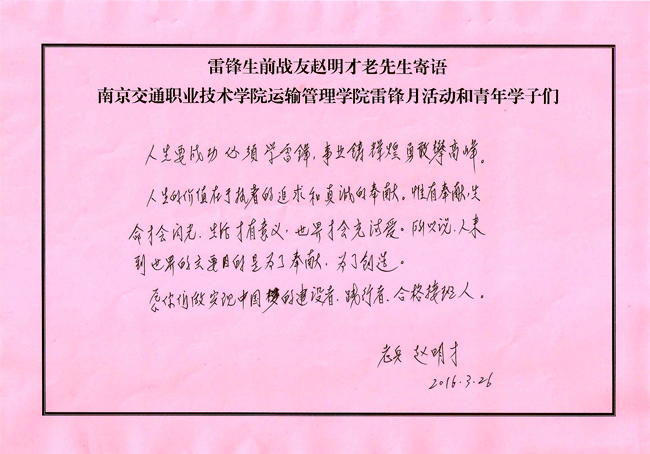 近日,运输管理学院青年学子们收到了一份让他们激动与惊喜的礼物:雷锋生前战友、中华雷锋文化促进会顾问、全国学雷锋报告团成员、全国青少年道德培养导师赵明才老先生的亲笔回信,勉励他们“人生的价值在于执着的追求和真诚的奉献。惟有奉献,生命才会闪光,生辉才有意义,世界才会充满爱。”