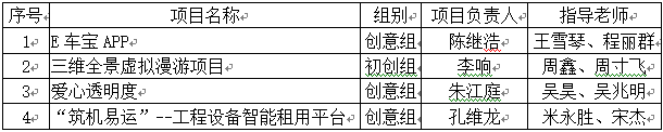 根据《学院关于遴选第二届中国“互联网+”大学生创新创业大赛“建行杯”江苏省选拔赛参赛项目的通知》精神,经学生申报,教务处、学工处联合组织专家评审,共遴选出4个项目参加江苏省第五届大学生创新创业大赛,名单如下: