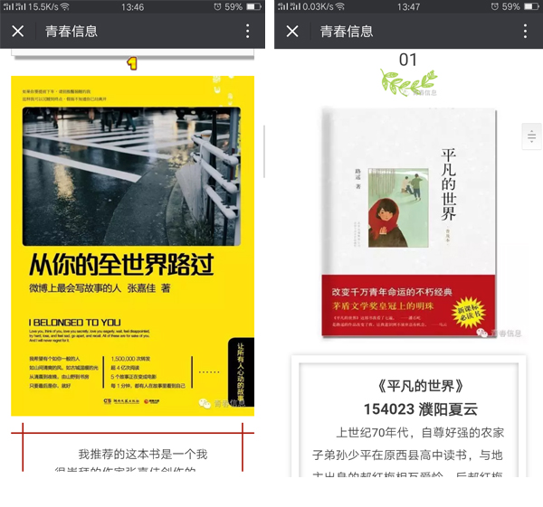 5月至10月,电子信息工程学院开展了活动主题为“我的中国梦?青春书香飘”的好书推荐活动。各团支部积极参与,将优秀书籍通过团总支微信平台进行推送,介绍推荐书目的主要内容和读后感。被大家广为推荐的书目有:《活着》、《平凡的世界》、《从你的全世界路过》、《我们都一样年轻又彷徨》、《百年孤独》、《鲁宾逊漂流记》、《简爱》、《梦在青春在》等。