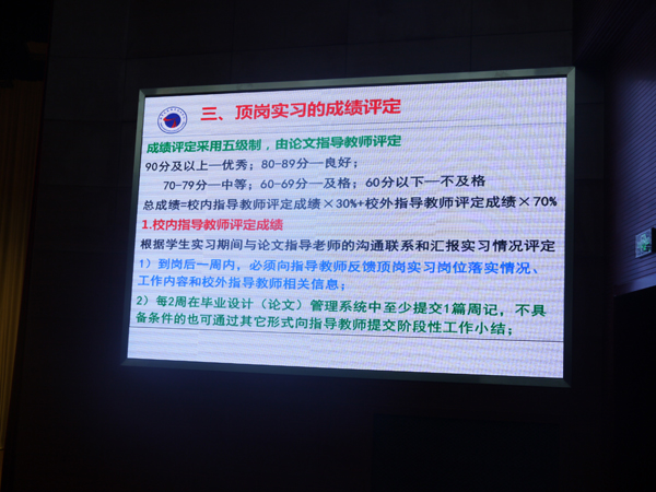 副院长陈林山介绍了顶岗实习期间教学安排和毕业设计要求;副书记王黛碧对顶岗实习期间学生管理、就业协议签订程序做了详细说明;赵勇书记从安全意义、安全意识和安全能力三个方面阐述了知意行的统一,并引用社会上传销、社会治安、网络电信诈骗等热点案例,做了一场生动的专题安全教育;文爱民院长结合当前经济、行业形势,从宏观和微观上分析了当前就业形势,引导同学们树立正确的择业观,克服急于求成的心理,本着“先就业,再择业”的原则,理性选择就业单位。