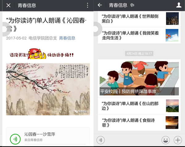 为陶冶学生的艺术情操,提升诗歌朗诵水平及人文素养,4月18日开始,电子信息工程学院开展了以“与诗歌同行 寻诗意人生”为主题的“为你读诗”活动。48名参赛选手声情并茂地呈现出众多精彩的朗诵作品,并在“青春信息”微信公众平台中连续推送39期。最终,来自164031班的单金菊同学凭借《致橡树》荣获一等奖。活动还评选出二等奖3名,三等奖5名,最佳人气奖1名。