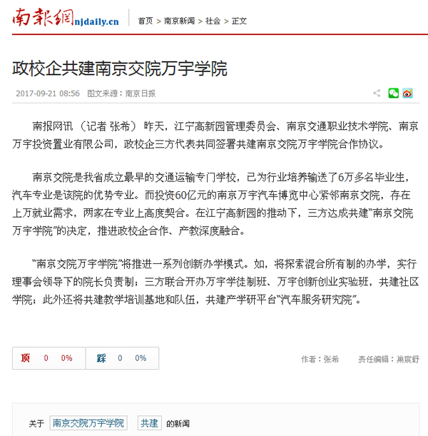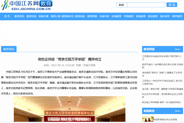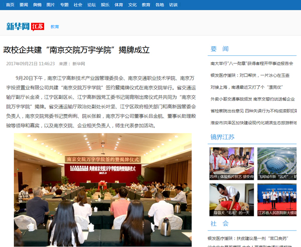 【媒体聚焦】南京交院万宇学院揭牌成立获媒体广泛关注报道