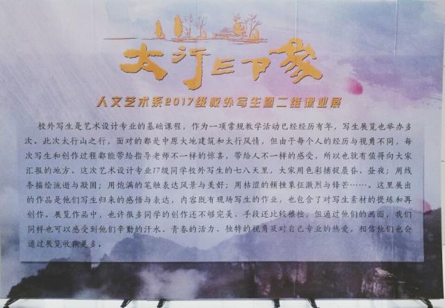此次展览主题为太行印象,是该系2017级艺术专业115名同学赴河南太行山区写生归来及二维设计基础课相结合的创作成果。展览作品的构思均来自于学生在写生过程中收集的素材和感受,表现手法既体现了学生原有的艺术基础,同时也利用课程项目化教学充分挖掘发挥学生想象力、创造力,从而实现了展览整体主题突出,形式丰富,内容生动,制作精良的效果。此次展览同时也反映了艺术设计基础课程在课程定位上要求学生由追求纯艺术美向追求设计应用美转变、追求再现技能向追求表现技能转变、由被动接受向主动创意转变、由常规思维向发散思维转变的目标。