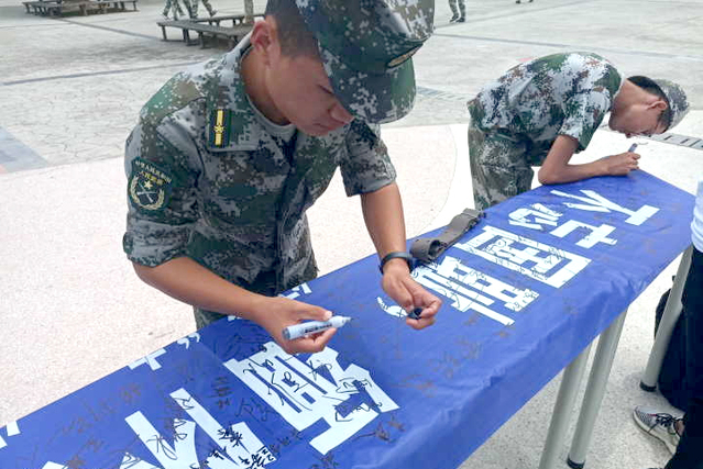 马克思主义学院“两课”任课老师也来到现场组织活动,众多师生自发参与。正在进行军训的大一新生和教官也踊跃来到现场参观了解。