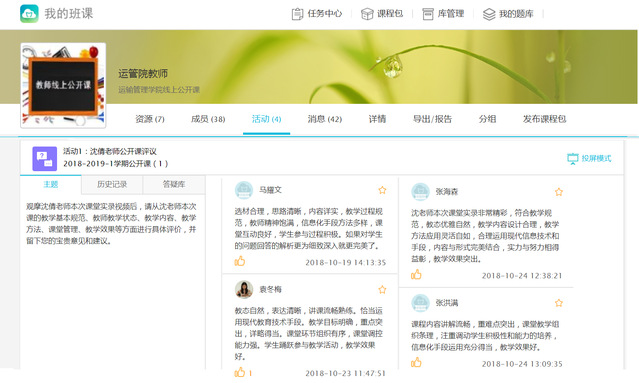 运输管理学院改革教师公开课模式,将公开课由线下迁移到线上,开展教师线上公开课活动。授课老师在做好教学设计的基础上实施课堂教学并拍摄成课堂实录视频上传蓝墨云班课,其他老师在观摩课堂实录视频后以在线留言的方式,从本次课的教学基本规范、教师教学状态、教学内容、教学方法、课堂管理、教学效果等方面进行具体评价,最后,根据《公开课评价标准》中的评分要点进行授课教师公开课综合评分,二级学院可通过云班课中的活动记录及评分情况全面掌握公开课活动开展效果。