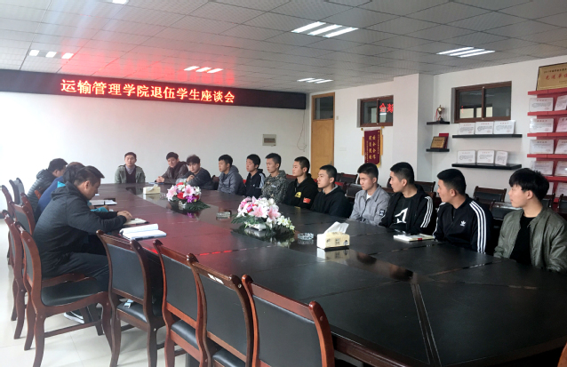 11月15日下午,运输管理学院召开了退伍返校大学生士兵座谈会。党总支书记王艳梅,校武装部王红星老师,学工办吴蓉蓉老师、马晓雷老师及近三年退伍复学大学生参加了座谈。会议由党总支葛明亮副书记主持。
