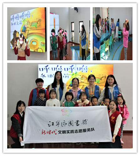 2019年4月13日,“信韵姐姐”来到江宁区图书馆总馆,通过表演的形式给小朋友讲述绘本故事“呼噜呼噜,冬眠之前”,帮助小朋友们认识了大中小,长短高矮,告诉孩子们乐于助人的快乐和意义,通过阅读将雷锋精神的种子种植在孩子们的心里。“信韵姐姐”和孩子们一起跳了“小兔子盖新房”手舞操,通过舞蹈的形式,帮助孩子更快、更好的理解绘本内容。同时,信韵星志愿者们帮助图书馆一起整理书籍,协助市民完成借阅手续。