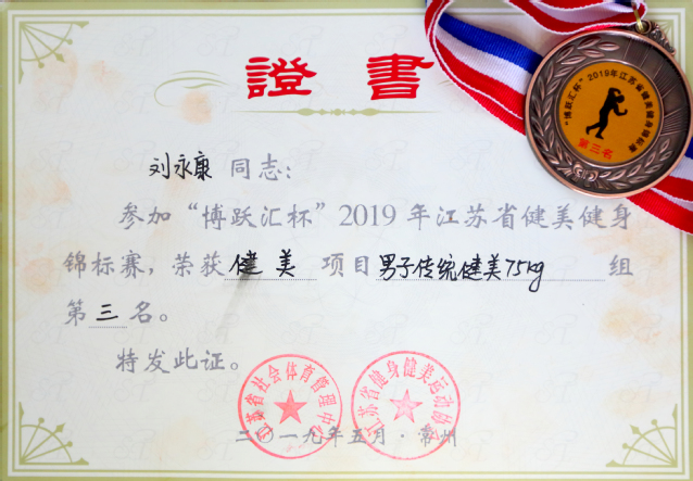 5月31日下午,“博跃汇杯”2019年江苏省健美健身锦标赛在常州举行,作为全省规格最高的健美健身比赛吸引了307名运动员、23支代表队参加。参赛选手有不少是全国级别的冠军。大学生健美建身俱乐部指导老师刘永康在75公斤级别传统健美比赛中荣获第三名;随后,在6月3日举行的2019“致诚健身杯”中式健美职业赛获得75公斤级传统健美第二名。