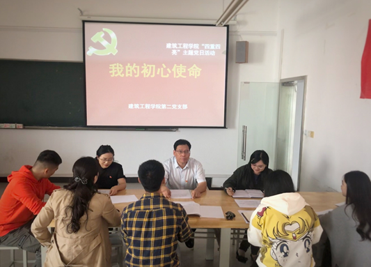 最后,建筑工程学院第二党支部书记曹莹组织党员对照“四讲四有”合格党员标准以及共产党人的初心使命,谈一谈作为党员干部、辅导员、教师,我们入党为什么、成长靠什么、为党干什么,引导大家重问自己的入党初心。