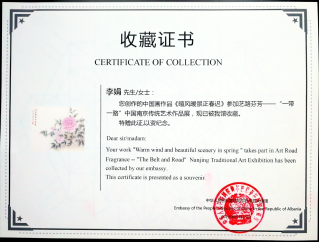 2019年9月23日,艺路芬芳——“一带一路”中国南京传统艺术作品展在阿尔巴尼亚国家历史博物馆开幕,我系李娟老师创作的中国画作品《暄风暖景正春迟》也参加了本次展览。