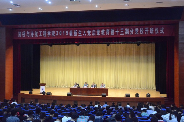 10月23日下午,路桥与港航工程学院在图书馆报告厅举行了2019级新生入党启蒙教育暨第十三期分党校开班仪式。全体19级新生、13期分党校全体学员参加会议,党总支书记李国之、副书记彭涌涛,特邀党建组织员、校关工委孟庆云老师,全体辅导员老师出席会议。