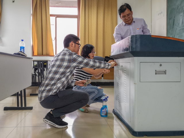 10月22日,建筑工程学院第二党支部组织广大教师、学生党员开展了一次深入教室的志愿服务活动。活动开始,建筑工程学院第二党支部书记曹莹在召集会上说明了此次志愿活动的意义所在。党总支书记陈晋中强调此次志愿活动的重点是深入基层,切实服务广大群众,解决师生身边存在的问题,杜绝形式主义。在此次志愿活动中,师生集体清理了广宇楼教研室的黑板、板下卡槽、讲台以及教研室内墙面的海报等,将志愿活动落到身边实事中。