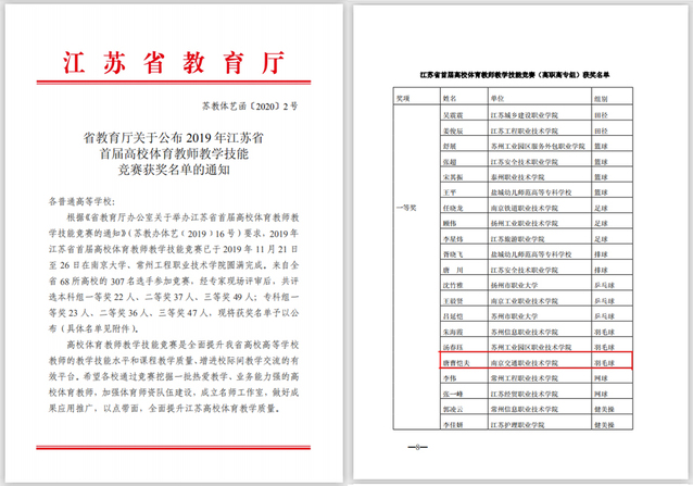 近日,根据《省教育厅关于公布2019年江苏省首届高校体育教师教学技能竞赛获奖名单的通知》苏教体艺函[2020]2号文件精神,学院三名参赛教师全部获奖。其中唐曹恺夫老师获专科组一等奖,朱兰君老师获专科组二等奖,陈烨青老师获专科组三等奖。