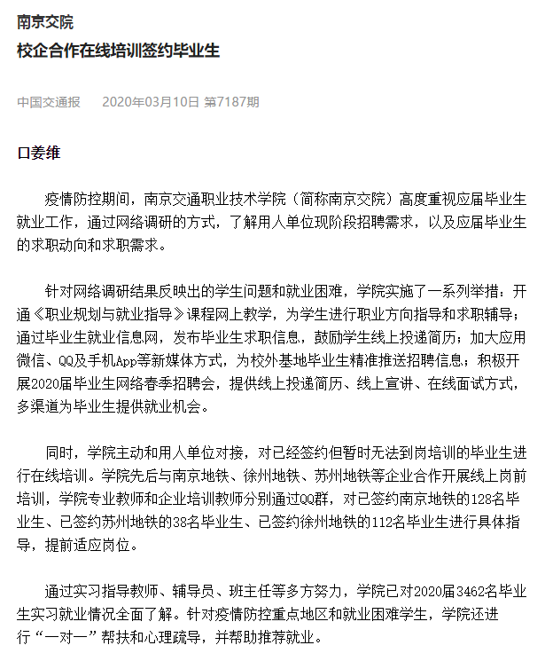 【中国交通报】南京交院校企合作在线培训签约毕业生