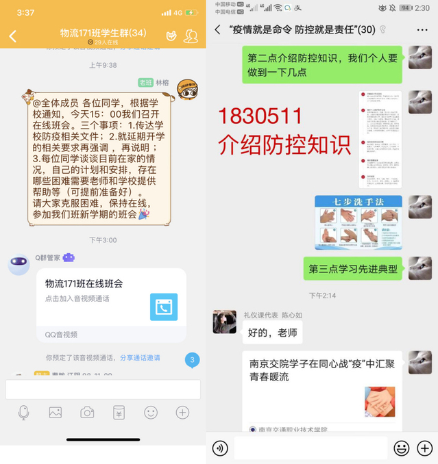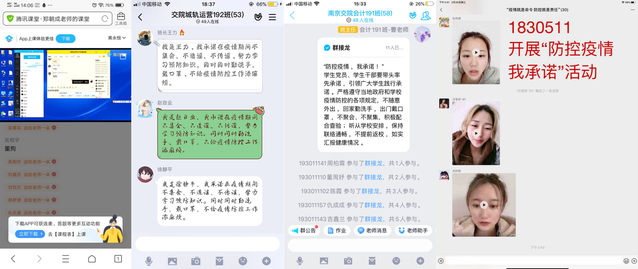 班主任们充分运用微信群视频、QQ群视频、微信语音、抖音直播、企业微信等各种新媒体形式传达学院领导讲话精神、带领大家学习疫情防控知识、先进典型、开展心理健康教育、督促学生积极参加线上教学、强调疫情防控期间的纪律要求、组织公开承诺。