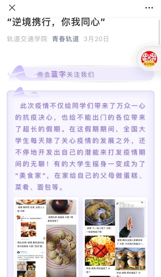 疫情防控期间,为引导我院学生以健康的心态应对当下的学习和生活,提高逆境下的心理健康水平,根据学校《关于在全校开展“逆境携行,你我同心”大学生心理健康教育主题活动的通知》的文件要求,3月14日——4 月 10日轨道交通学院在党总支的领导下开展了“逆境携行,你我同心”系列在线心理健康教育活动。