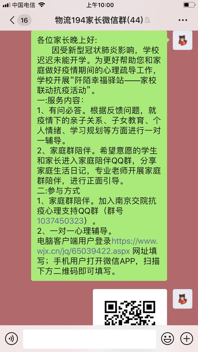 同时,学院结合自身实际,依托微信家校联系群、青春运管微信公众号、运管微博等媒体平台,开展了“家校联动抗疫”、“抗疫心连心”心理支持、“育心育报、网文导育”活动,以推送“育心”网文,宣传心理防护知识、在线家庭心理辅导等形式,帮助心理困难家庭解决实际问题并得到学生家长积极的支持和回应。