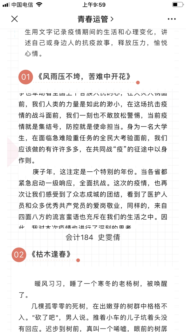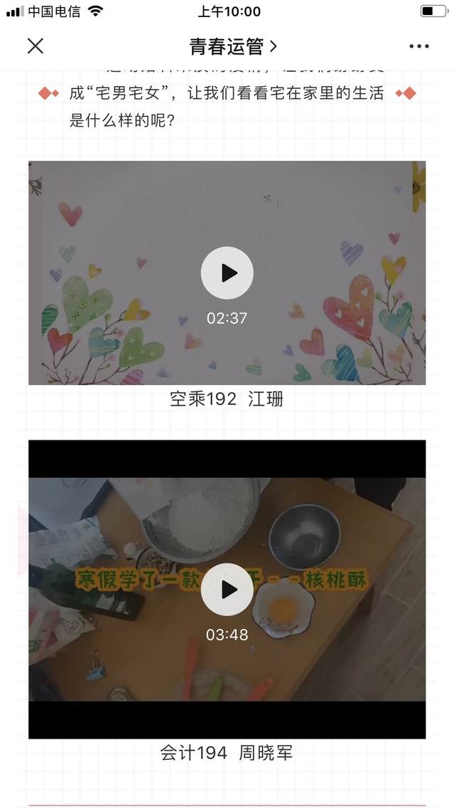 活动期间,学院共收到200多份文字、视频类作品,这些作品记录、分享了同学们“宅家”学习、生活、锻炼等种种场景以及抗疫期间个人心路历程,反映同学们在疫情防控期对生活的热爱以及面对挫折、逆境的勇气和信心。