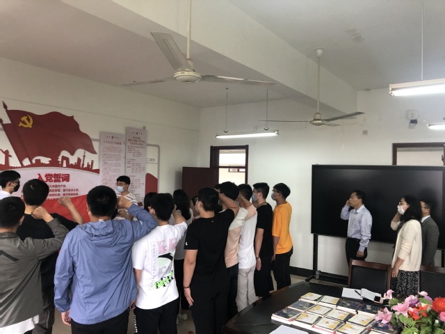 会上首先举行了新党员入党宣誓仪式,党支部书记黄阿梅老师带领全体预备党员面向党旗庄严宣誓,与会党员一起重温了入党誓词,接受党性教育。接着黄老师对十七名学生预备党员情况作了介绍,并请支部入党介绍人为新党员佩戴党员徽标,赠送了《习近平的七年知青岁月》和《我们》两本书籍。郭子扬同学代表全体预备党员发言,讲述了自己在新冠肺炎疫情防控期间参加抗疫志愿服务的历程和感想,表示要在今后的工作中发扬抗疫精神,更好地发挥党员先锋模范作用。