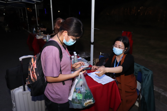 全天志愿者们分工协作,报到现场秩序井然。学院领导、辅导员老师“挑灯夜战”,加班加点。晚上22:50,张文斌院长、陈晋中书记接待了当日返校的最后一名学生。