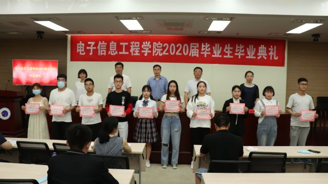 6月5日上午,电子信息工程学院2020届学生毕业典礼在图书馆B203隆重举行。按照新冠肺炎疫情防控工作的要求,毕业典礼采用“线上直播+线下现场参与”的方式进行。学校应海宁副校长,电子信息工程学院全体院领导、辅导员、教师代表及2020届70余名优秀毕业生参加了现场毕业典礼,其余毕业生均通过网络直播方式进行观看。毕业典礼由电子信息工程学院吴兆明院长主持。