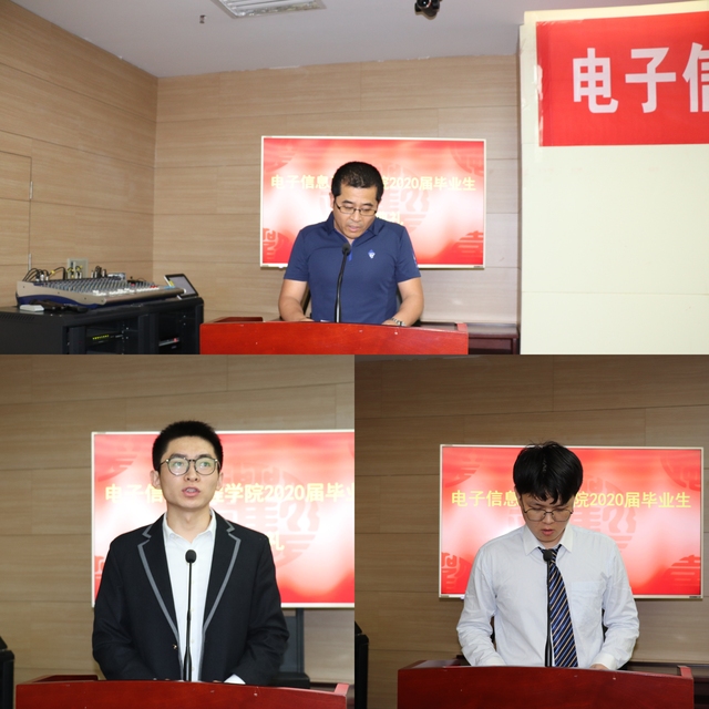 毕业典礼在庄严的国歌声中拉开帷幕。电子信息工程学院党总支杨金刚书记宣读了《关于表彰2020届优秀毕业生表彰决定》,主席台领导为受表彰的毕业生代表颁发了荣誉证书。毕业生代表、江苏省三好学生1740122班潘佳兴与大家共同回忆了大学三年的学习与生活,表达了对母校的留恋与不舍;在校生代表、院学生会主席1840111班阎镇高对学长学姐们的关心与帮助表示感谢;教师代表、省技能竞赛一等奖项目指导教师孙丹东对同学们提出了殷切希望及美好祝福。