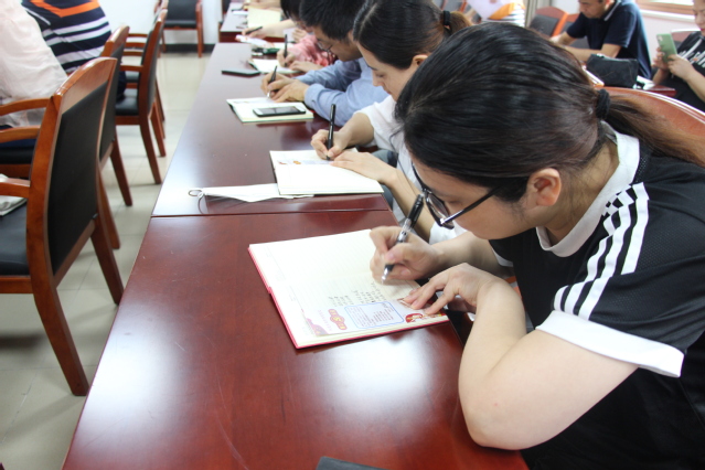 最后,学院党总支书记滕兆霞向每一位党员同志颁发了廉政书签。党员同志纷纷在书签上庄重的签下自己的名字,承诺做一名永远听党话、跟党走,忠诚干净担当的共产党员。