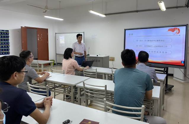 第一党支部书记胡俊以“抗击新冠疫情、停课不停学”为题,强调党和国家在抗疫中的制度优势和强大组织执行能力,结合工作实际,充分肯定了学校党委对疫情常态化下的“停课不停学”各项工作的部署和有效落实;第二党支部书记边伟以“落实落细疫情防控措施、有序推进学校复学复课”为题,介绍了学校在党委领导下复工复学各项工作扎实有序开展,教师党员扎实做好疫情防控形势下的线上教学、返校复学教育教学工作中发挥的先锋模范作用;第三党支部书记唐志桥解读了习近平总书记防控新冠肺炎疫情系列讲话精神学习,结合实训中心工作特点,如何做好疫情防控和履行好本职工作;第四党支部书记王雪琴以“抓紧抓实抓细常态化疫情防控工作——细节决定成败”为题,阐述了党中央坚持全国一盘棋、集中统一领导疫情防控的制度优势和各级党组织、广大党员在疫情防控斗争中践行初心使命的生动事迹。