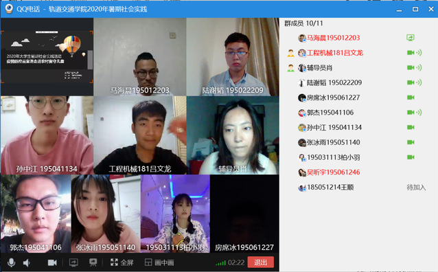 2020年7月19日,轨道交通学院暑期社会实践团队通过线上视频会议形式举行第一次培训会议,会议由团总支肖君宜老师主持,实践团队全体成员参加了本次线上培训会。