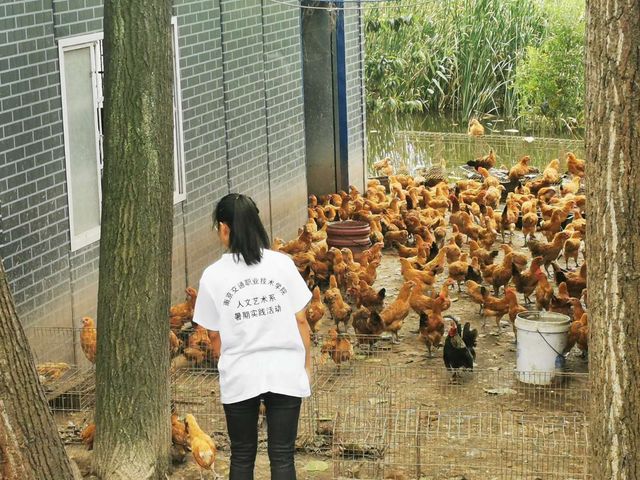 2020年8月3日,人文艺术系暑期实践团走进队员何丹丹的家乡——安徽省六安市霍邱县周集镇和庄村,实地走访考察当地的养殖业。在养殖场场长的带领下,实践队员穿上专门的防护衣服,经过严格消毒后进入养鸡场,养鸡场分为三大区域,第一区域是孵化区域,第二区域是养殖区域,第三区域就是收集鸡蛋区域,最后环节就是工人对土鸡蛋的收集、清洗和打包。随后,队员又参观了养鸽子区域和养鸭子区域。