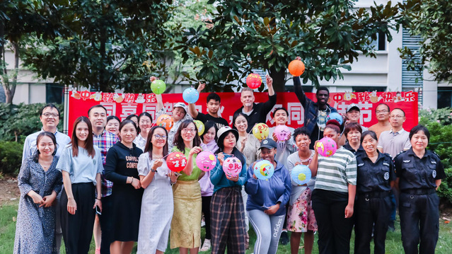 9月30日下午,国际合作与交流办公室工作人员、部分党员老师、留学生宿舍管理老师、“一带一路一家人”活动中国学生志愿者与在校的外籍师生们齐聚一堂共同庆祝中秋佳节。