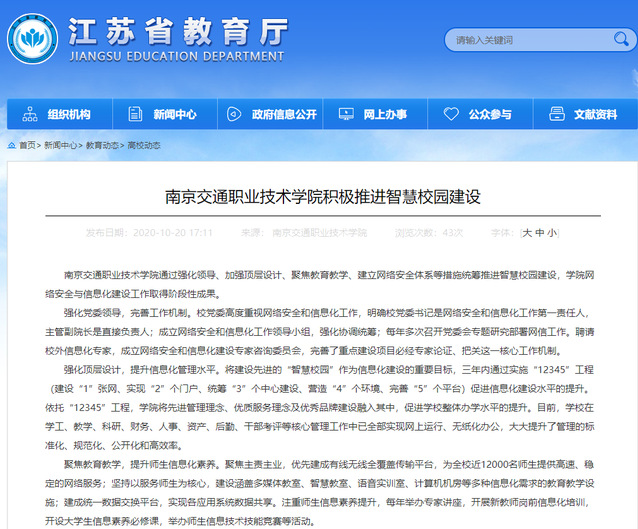 【江苏省教育厅】南京交通职业技术学院积极推进智慧校园建设